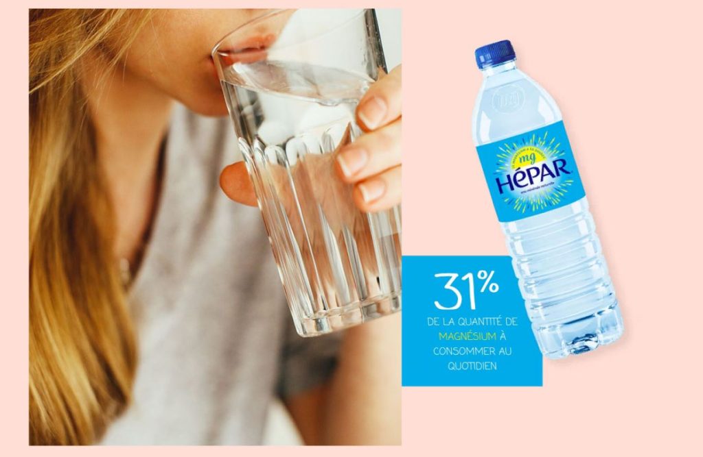 Le saviez-vous : L'eau Hépar a un autre atout : son magnésium est mieux absorbé que celui d'origine alimentaire. Avec 110 mg de magnésium par litre et zéro calorie, il n'y a que des avantages à boire chaque jour cette eau minérale.