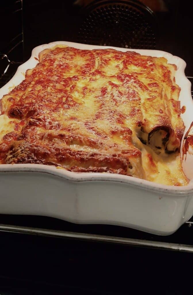 Enfournez pendant 30 à 40 minutes, jusqu’à ce que les cannellonis soient tendres (vérifiez en piquant avec un couteau) et que le dessus soit bien gratiné.