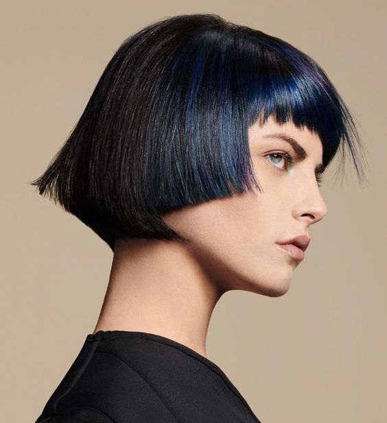 Un magnifique A-line bob bleu sur une base brune. N’hésitez pas à porter cette coupe chic qui s’adapte à toutes les saisons !