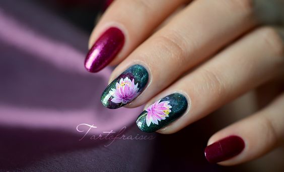 Dans ce Nail art, les fleurs de nénuphar roses contrastent avec le fond vert foncé métallisé. Cette manucure est idéale pour égayer la saison automnale.