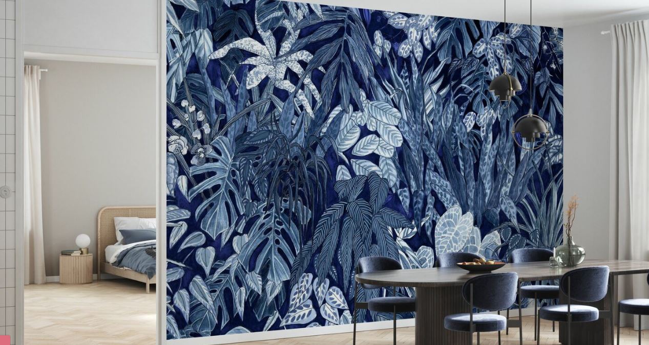 Ce papier peint spectaculaire introduit un petit côté naturel chez vous tout en restant dans la teinte bleu indigo.