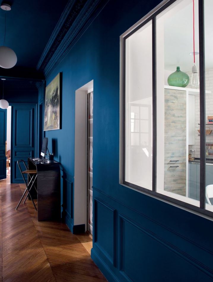 Dans un couloir, le bleu roi appliqué sur un mur ou même sur les deux s’il présente une belle largeur confère à ce dernier un côté cosy et supprime radicalement l‘impression un peu terne et ennuyeuse que l‘on retrouve dans de nombreux couloirs. Vous pouvez également choisir de l’appliquer sur les portes seulement pour casser le rythme et donner du relief.