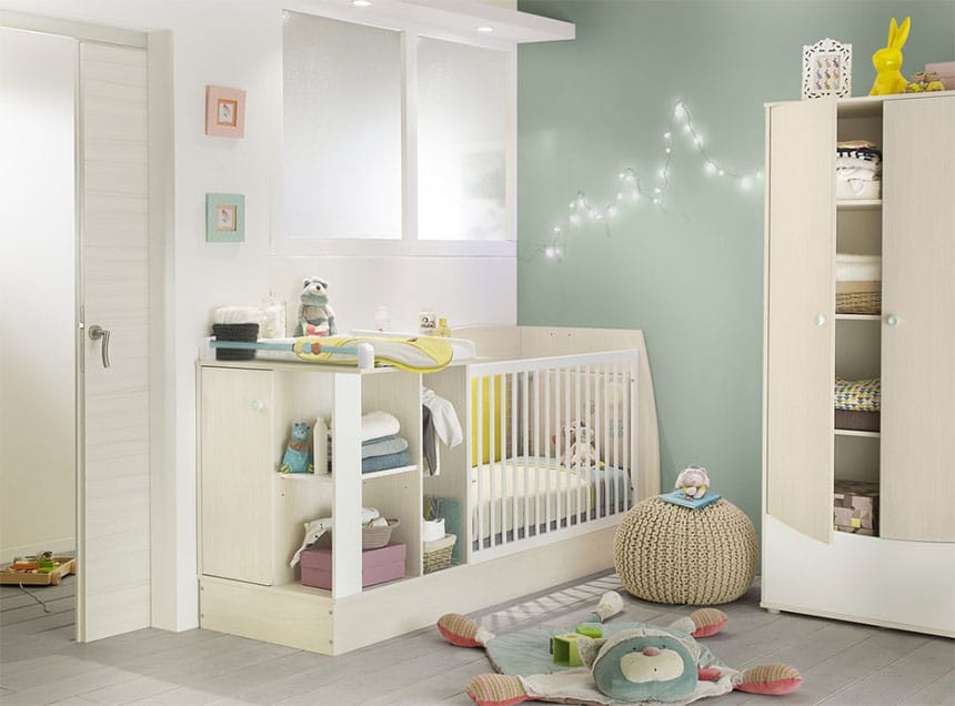 Les rangements ouverts sont toujours une alternative intéressante, ils peuvent être peints à l’intérieur, ou vous pouvez y mettre un joli papier peint. Vous pouvez également y mettre quelques objets déco adaptés, féminins ou masculins quand vous rentrerez de la maternité. C’est une bonne alternative. Côté armoire, lit et commode, évitez les meubles trop marqués.