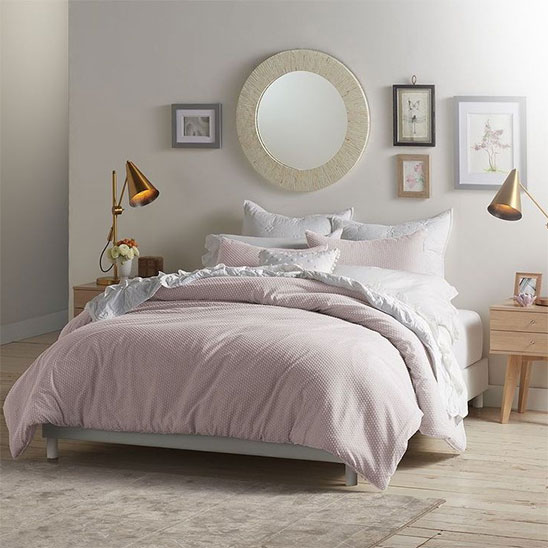 Dans cette chambre, c’est l’ambiance douce et cosy et quelques petits détails comme les lampes couleur or qui apportent ce côté romantique. Le raffinement de la déco et du linge du lit n’y est pas pour rien non plus.