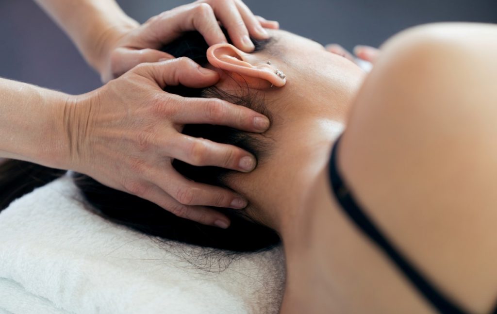 Les mains d’un ostéopathe sur le crâne : une sensation de bien-être
