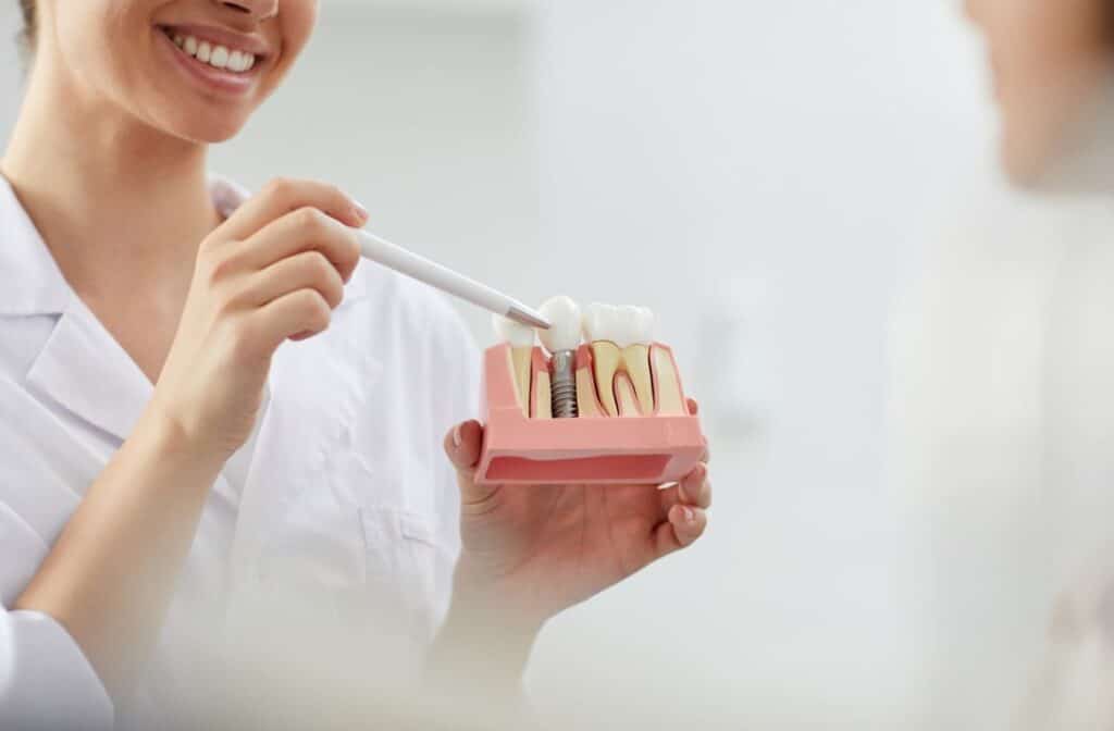 Le but est de remplacer définitivement une ou plusieurs dents manquantes. Une petite vis en titane, insérée dans l'os de la mâchoire, sert de racine artificielle. Une prothèse (fausse dent) en céramique vient ensuite se fixer sur cette racine.